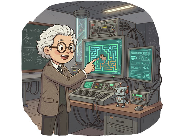 このマシンは、仮想の「迷路」を解くネズミをシミュレートし、失敗から学んで(強化学習)、だんだん賢くなっていく能力を持っていました。