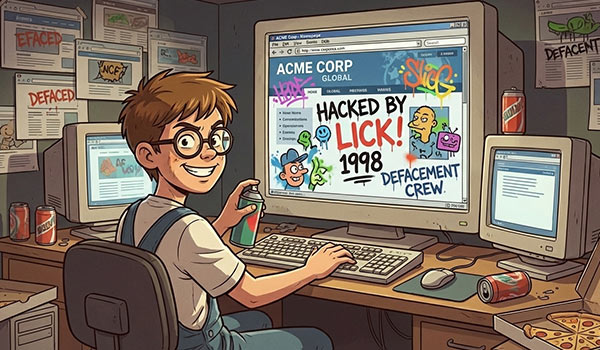 90年代後半、企業のトップページを書き換え、「Hacked by XXX」というメッセージや、政治的なスローガン、あるいは単にふざけた画像を貼り付ける「Web改ざん(Defacement)」が流行。